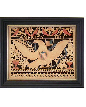 The perfect addition to Early American, historical or traditional decor. A great gift for a new US citizen as well. Lacy eighteenth-century cutwork was cut freehand with scissors from strong rag paper. Authentic-looking America’s Eagle Scherenschnitte (the art of paper cutting design) is laser cut and then placed against black paper stock and framed with two layers of glass for added depth. Framed in a 10" x 12" black wood frame with gold edge. The back is covered in craft paper and finished with a saw tooth hanger.